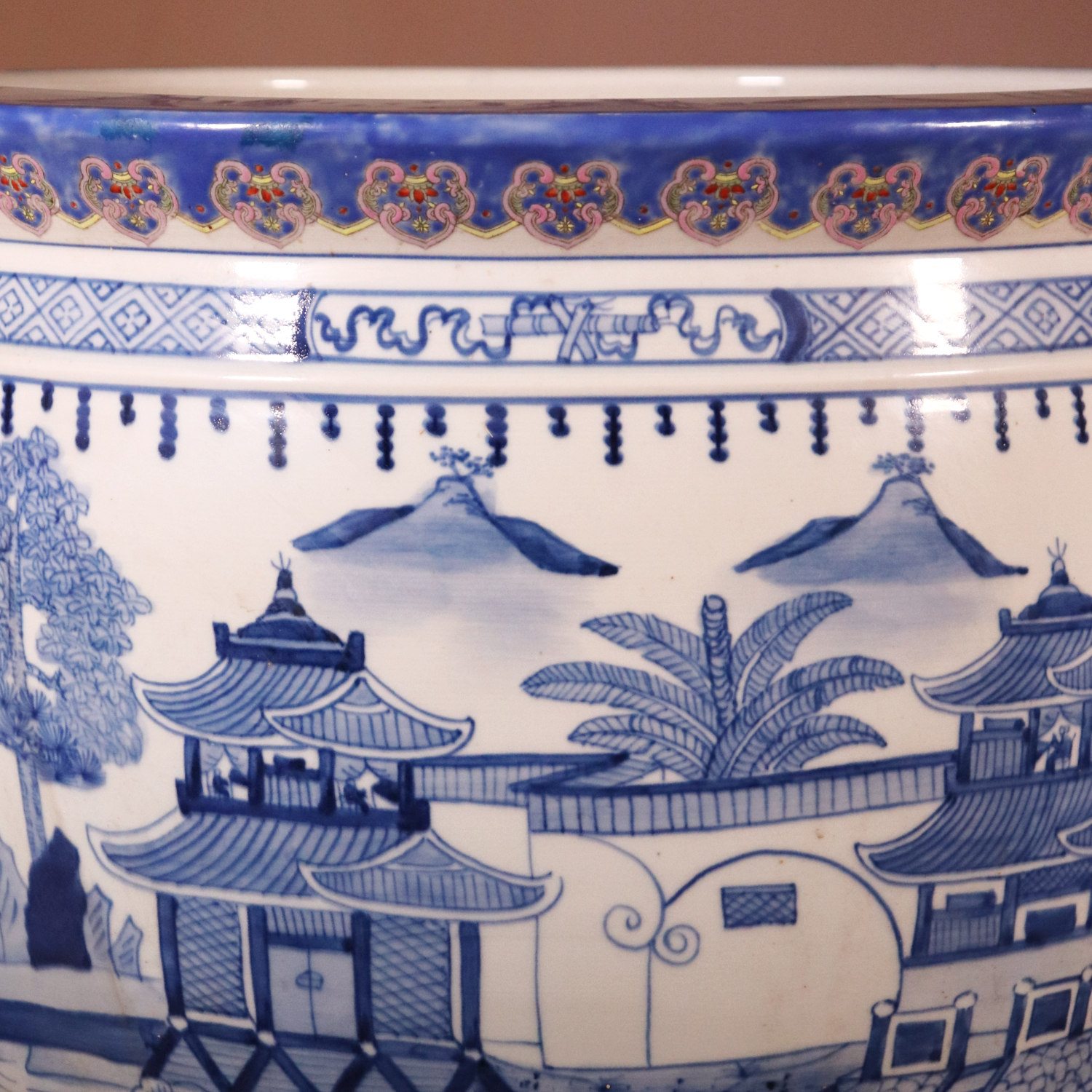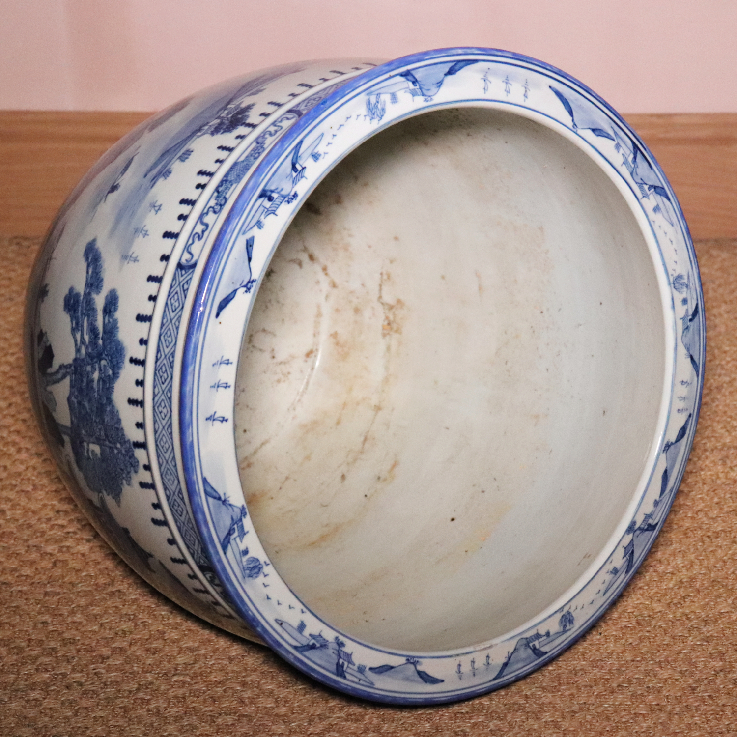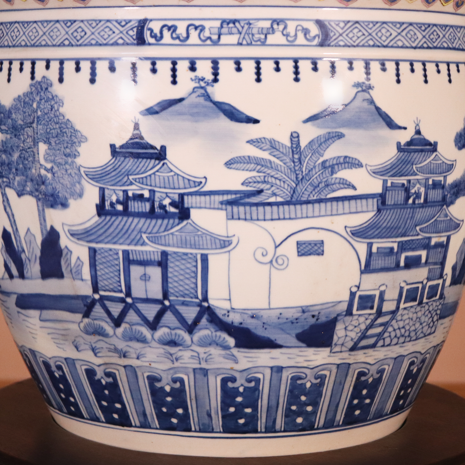 A Chinese blue & white fish bowl or jardiniere, circa 1920, on a wooden stand.