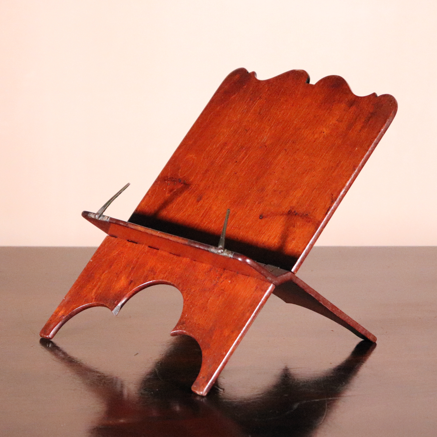 A rare George III mahogany folding book or reading stand, circa 1810, the printed paper label ‘Jas. Mein, Cabt Maker, Kelso’ with further ink inscriptions.