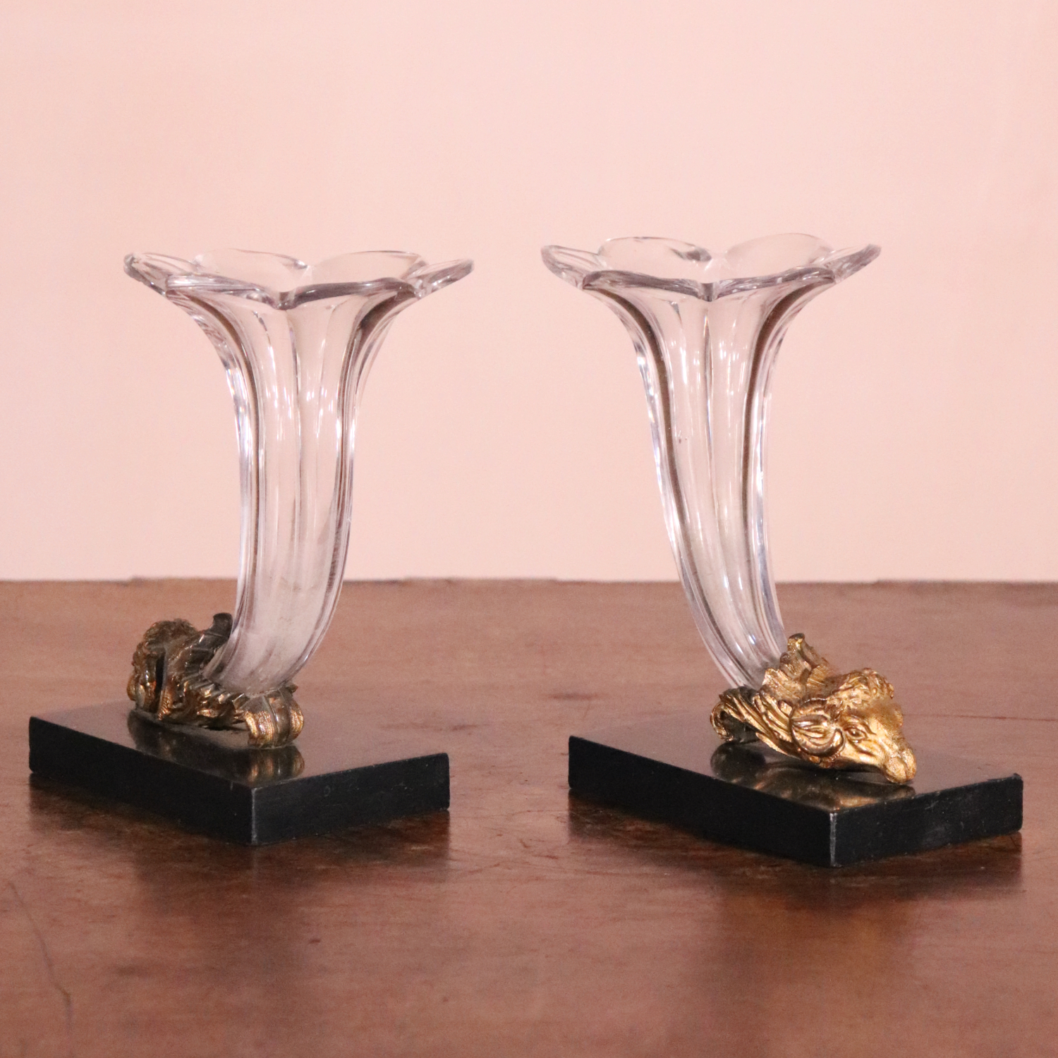 A pair of gilt bronze and cut glass Cornucopia vases, English, circa 1820, on Ashford black marble plinth bases.