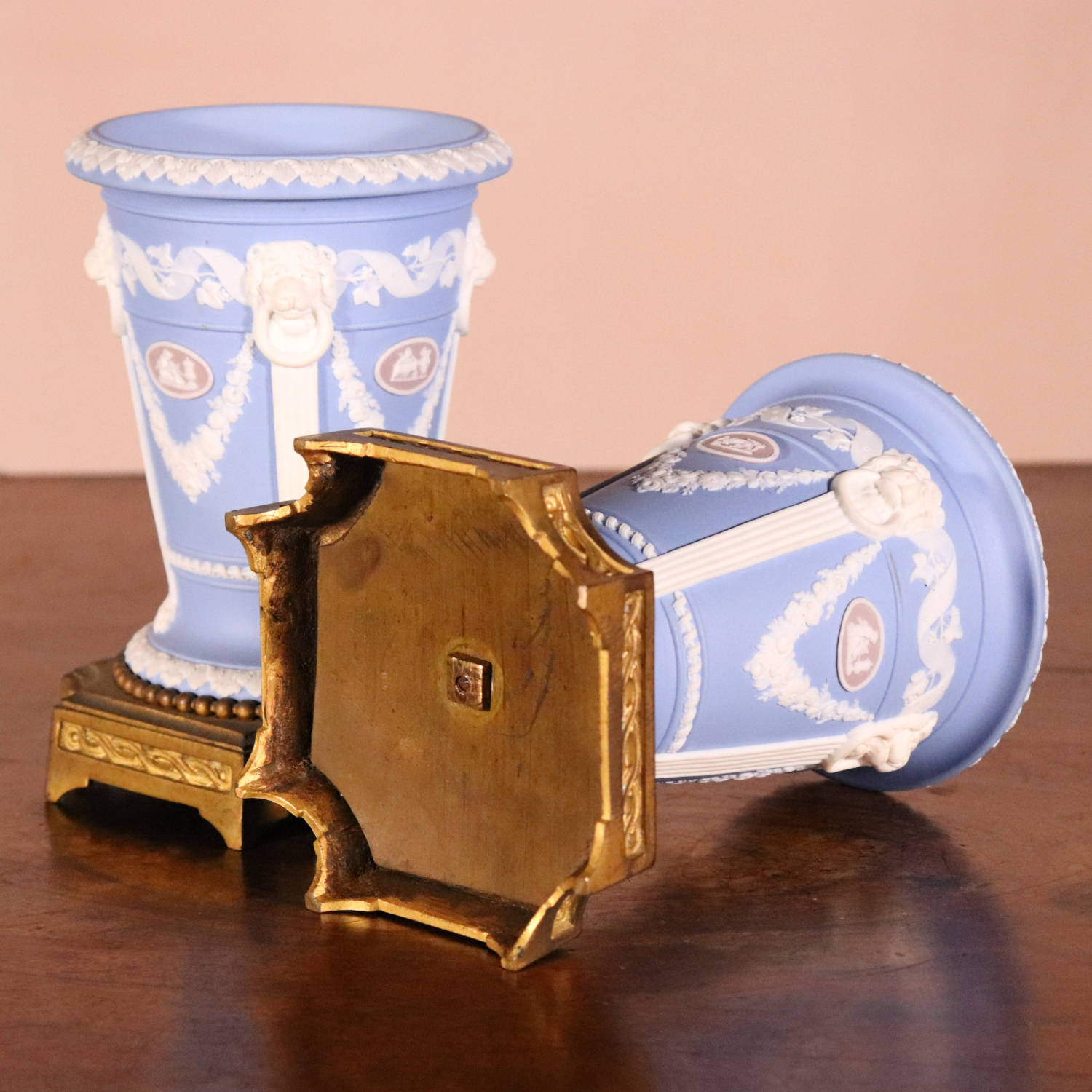 A pair of Wedgwood two colour Jasperware vases, date stamped for 1867, with original gilt bronze plinth mounts.