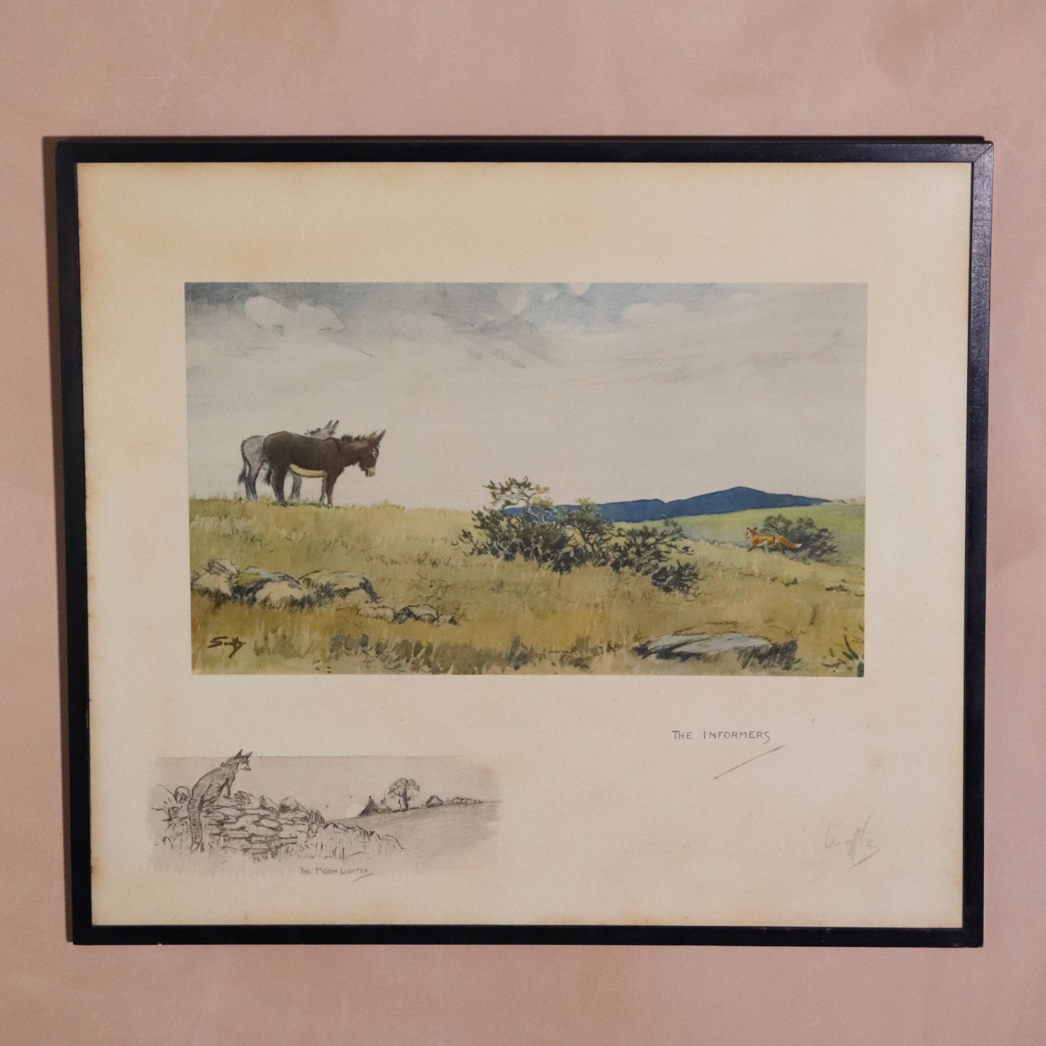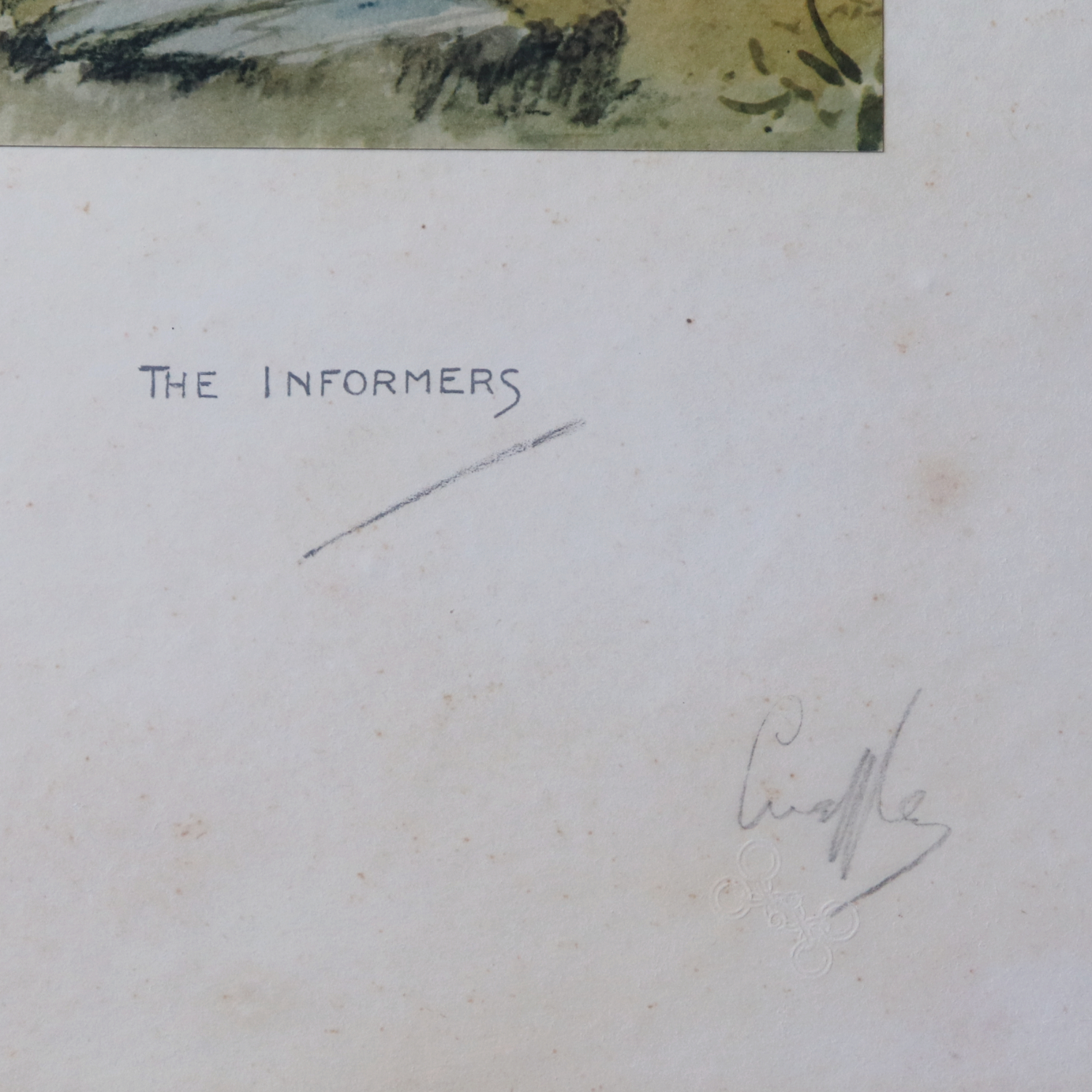 ‘The Informers’, circa 1934, signed in pencil and with snaffle bits blindstamp, printed in colours, in the original ebonised frame.